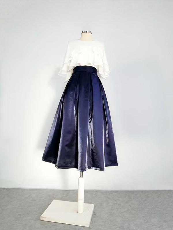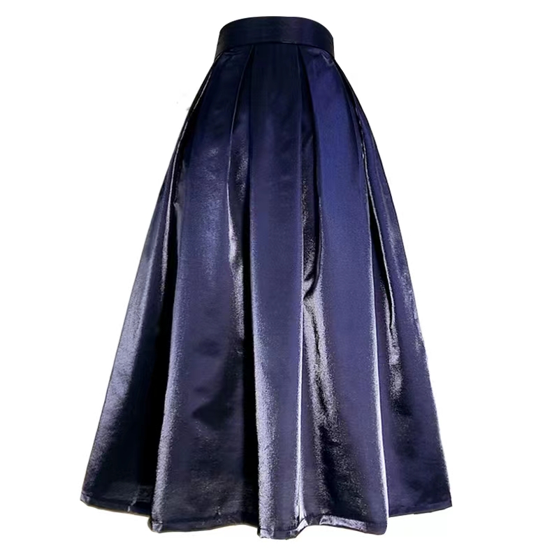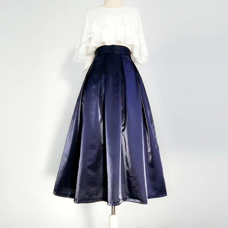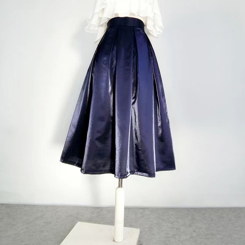 NAVY BLUE Pleated Satin Skirt Holiday Outfit Women Vintage Pleated Midi Party Skirt Outfit Custom Size