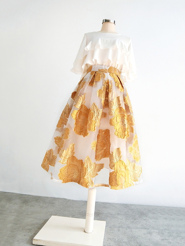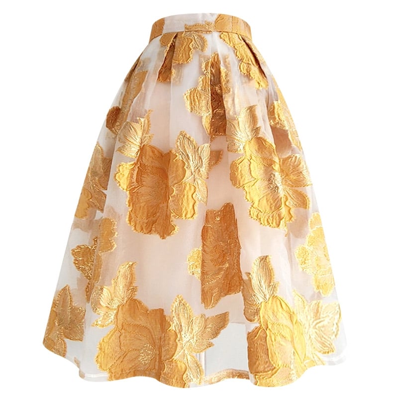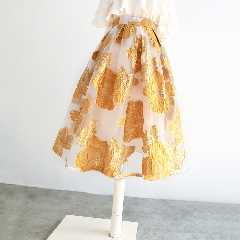 Summer GOLD floral Party Skirt Outfit High Waisted Plus Size Pleated Midi Party Skirts