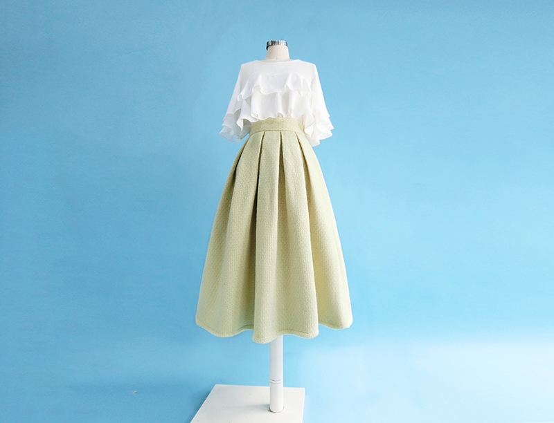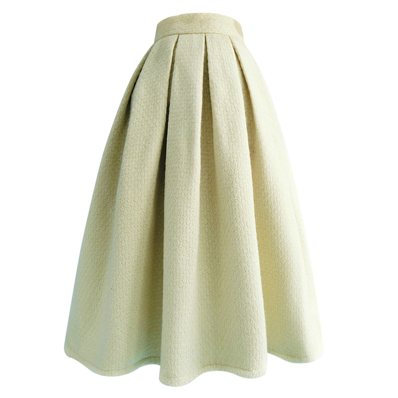 * This tea length pleated skirt is made of wool cotton with romantic element.