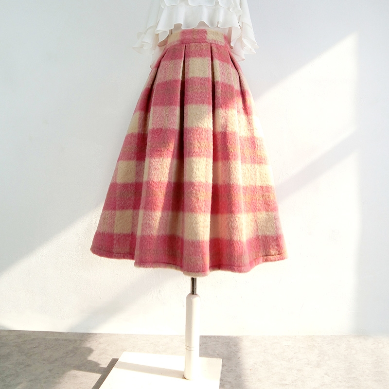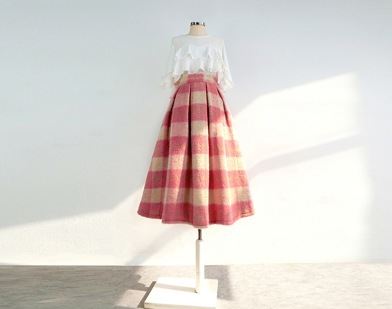 PINK Plaid Winter Party Skirt Outfit High Waist A-line Pleated Midi Pleated Skirt Warm Midi Party Skirt Custom Plus Size