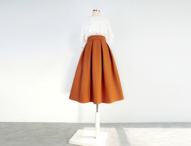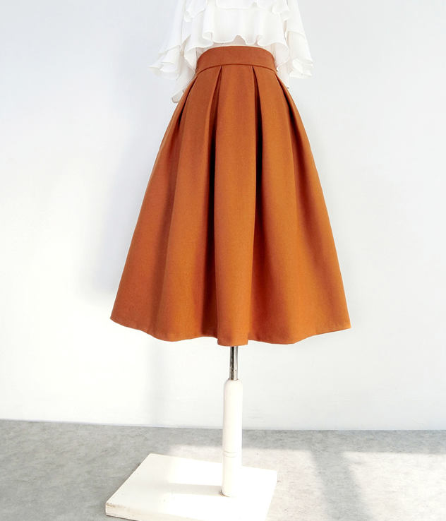 Women Winter Midi Skirt Rust Color Skirts Romantic Party Skirt Outfit Custom Plus Size Full Pleated Skirt Tea Length Christmas Holiday Outfit.