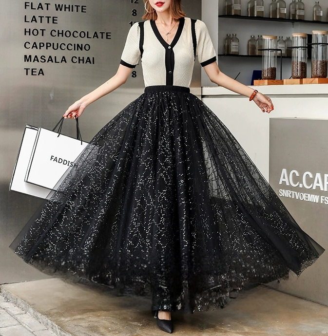 Black Sequin Tulle Skirt Holiday Outfit Women's Black Sparkly Skirts Black Maxi Tulle Skirt Custom Plus Size Tulle Skirt