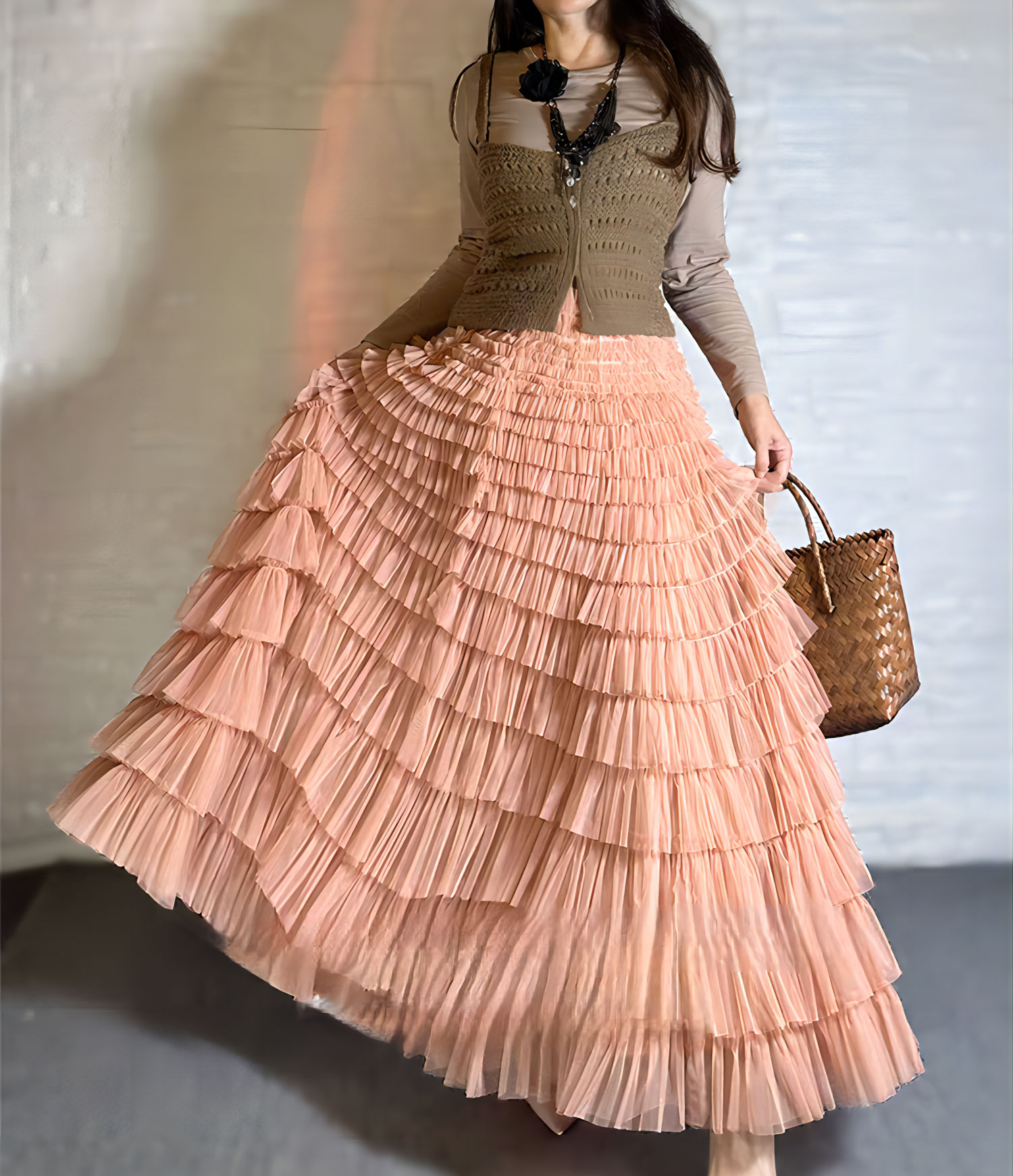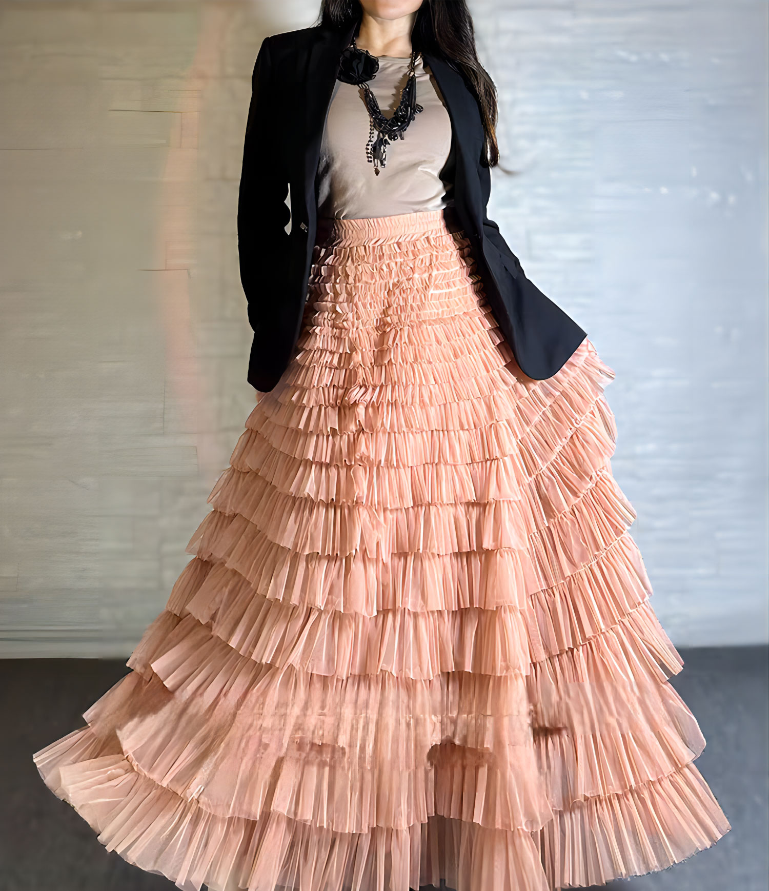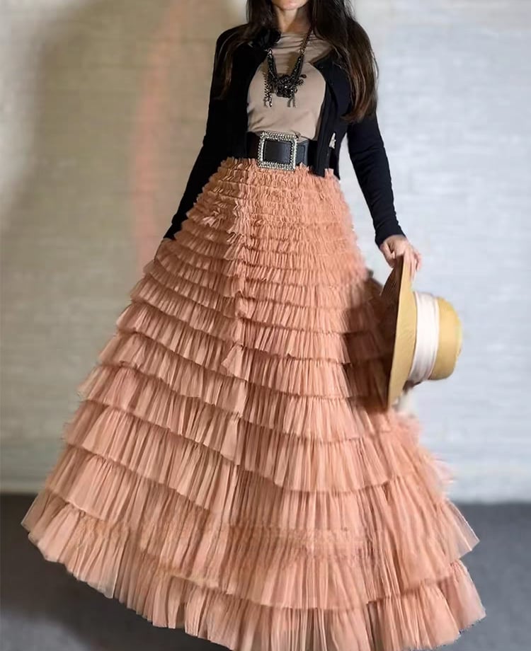 Women Pink Nude Tulle Maxi Skirt Outfit Tiered Maxi Tulle Skirts Custom Plus Size Layered Maxi Skirt Prom Maxi Skirt