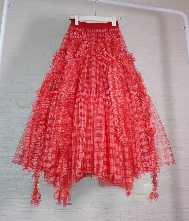 Women Red Plaid Long Tulle Skirts High Waisted Tiered Tulle Skirt Holiday Outfit Custom Plus Size