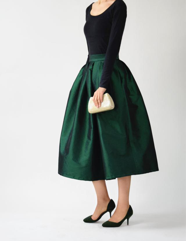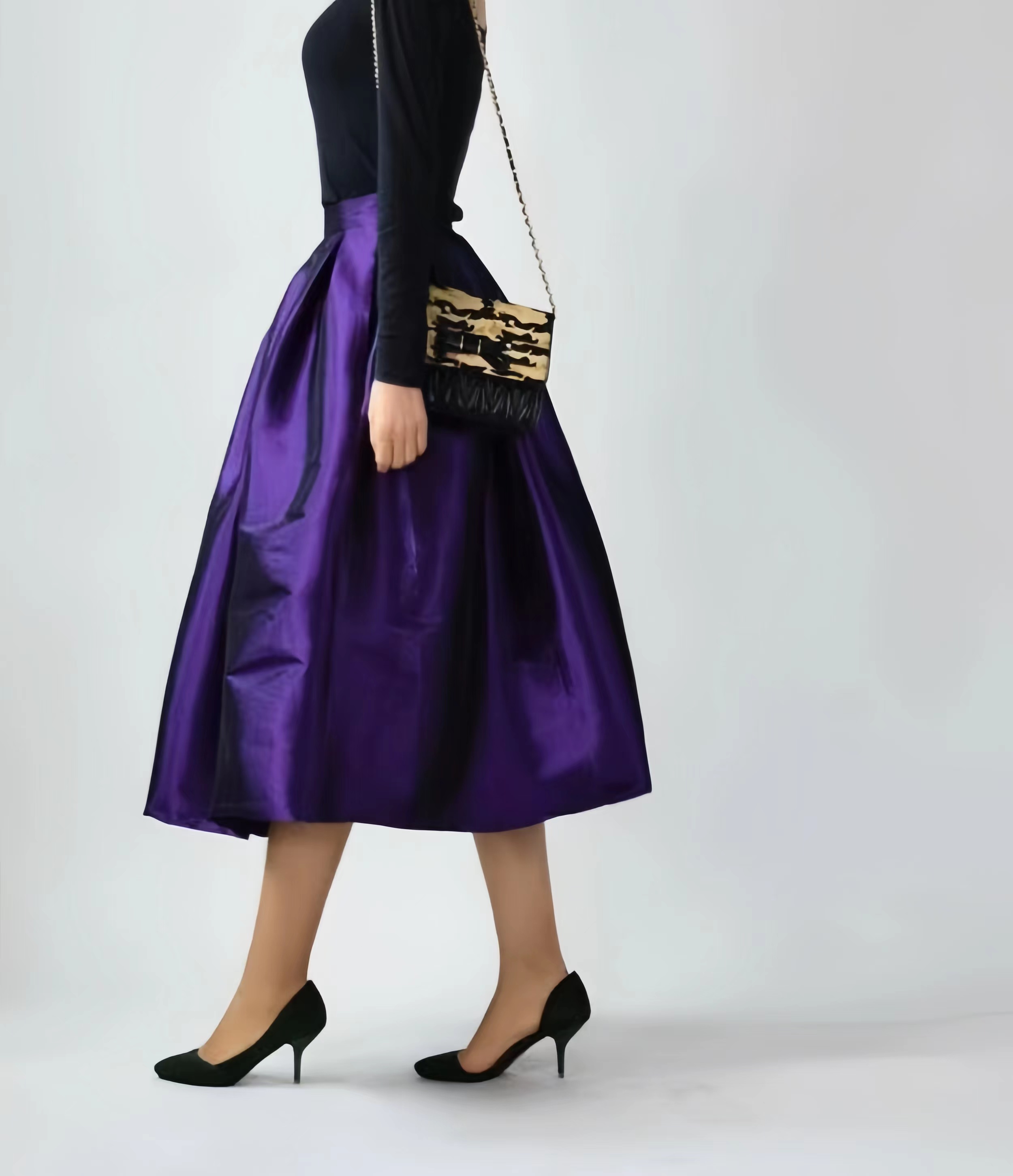 PURPLE A-line Taffeta Skirt Outfit Women Custom Plus Size Tea Length Pleated Skirt A-line Pleated Holiday Party Skirt with Pockets