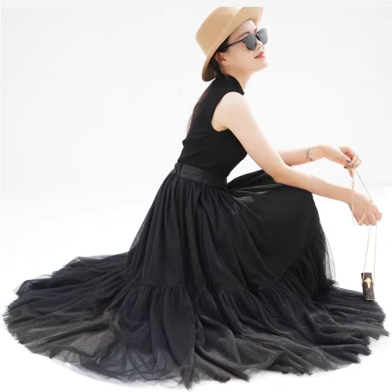 Black A-line Tulle Midi Skirt Black Midi Fluffy Skirt Women Custom Plus Size Black Layered Tulle Skirts