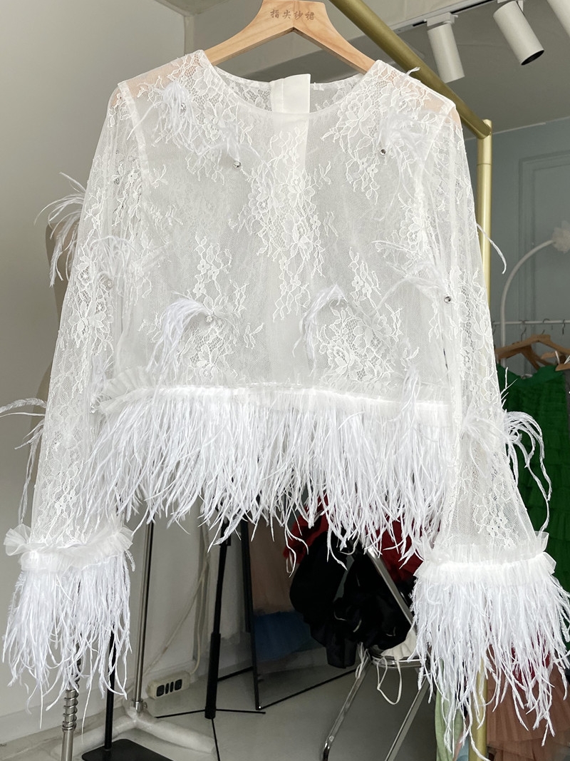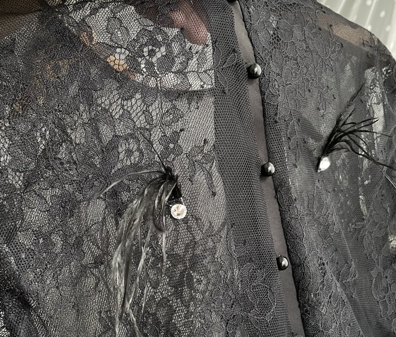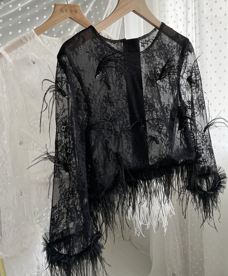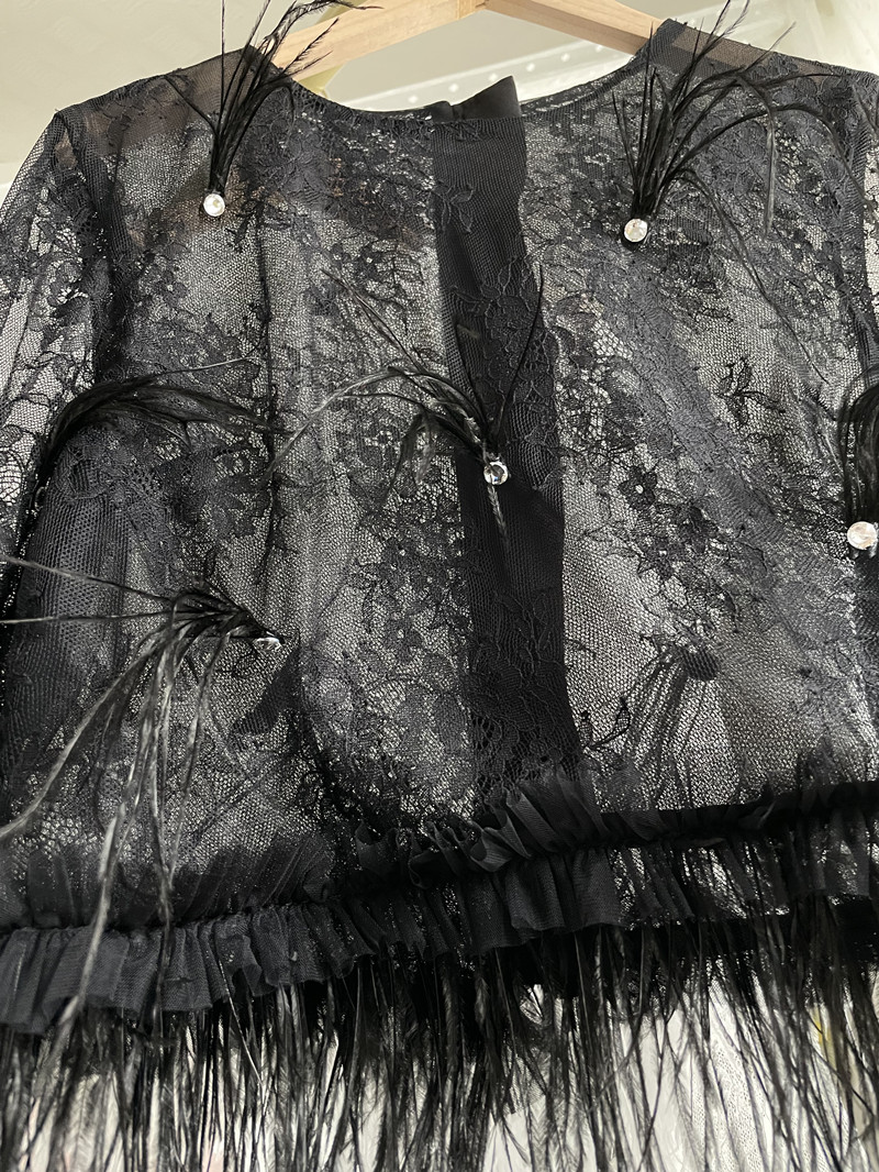 BLACK Feather Top Long Sleeve Crop Lace Top Outfit Custom Plus Size Wedding Guest Black top with feather trim on sleeves