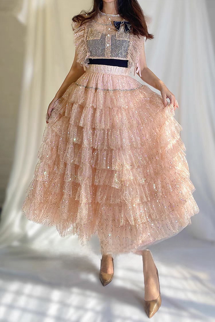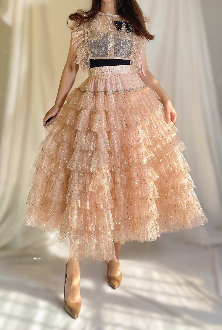 Champagne Gold Long Sequin Tulle Skirt Outfit Women Custom Plus Size Sparkly Layered Tulle Skirts