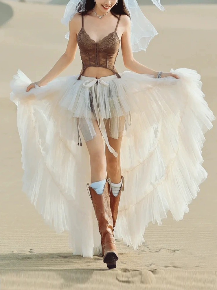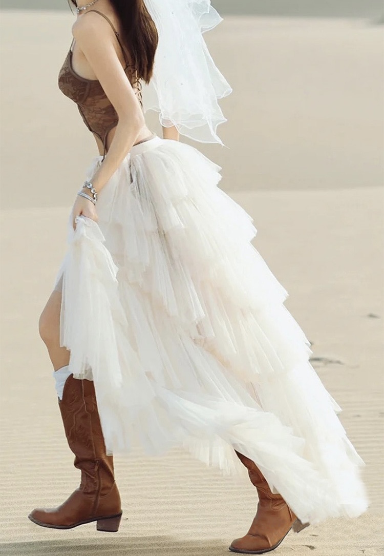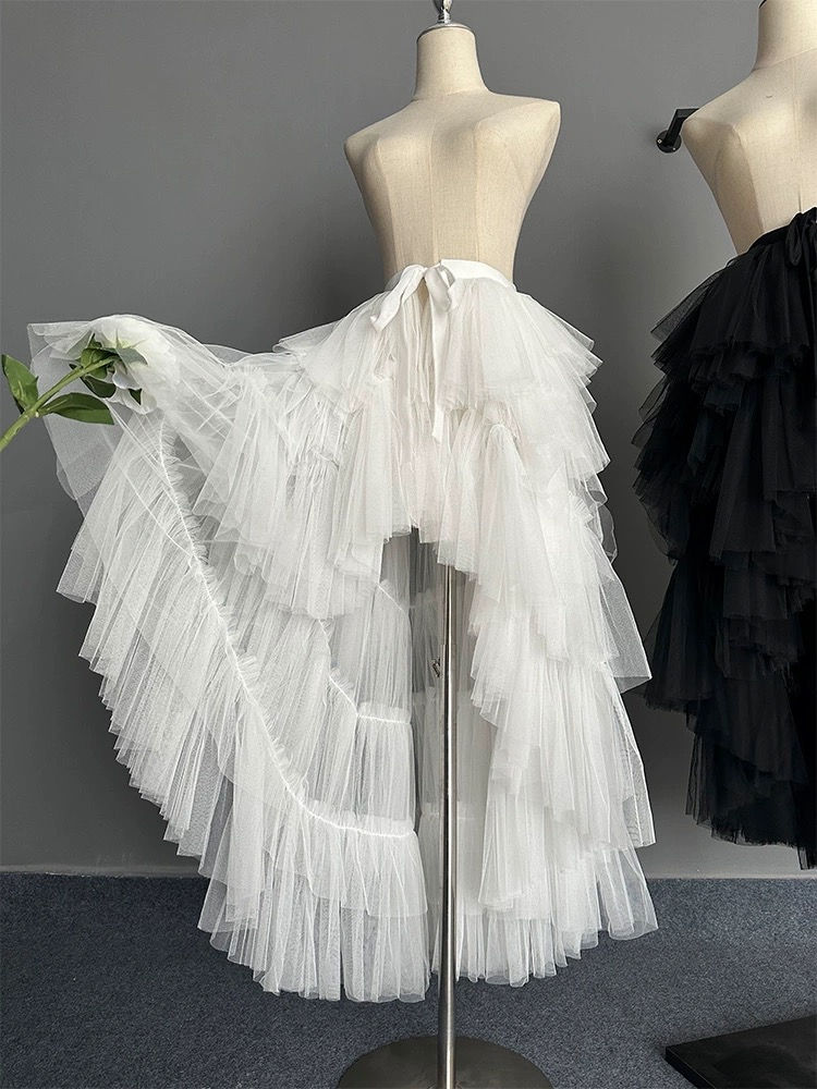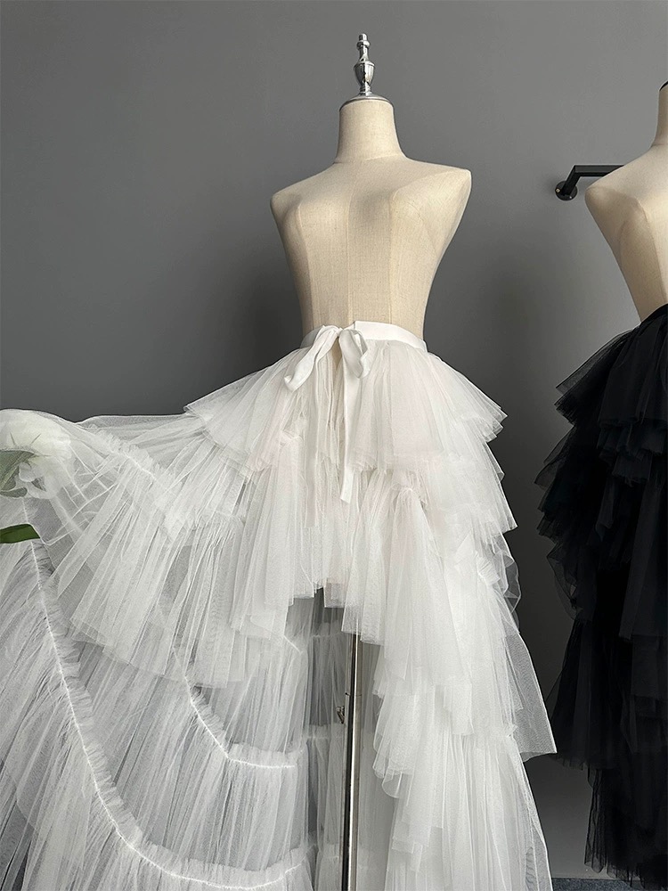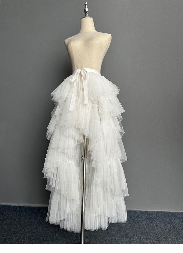 White High Low Layered Tulle Skirt, Bridal Tulle Maxi Skirt, Romantic Wedding Party Outfit
