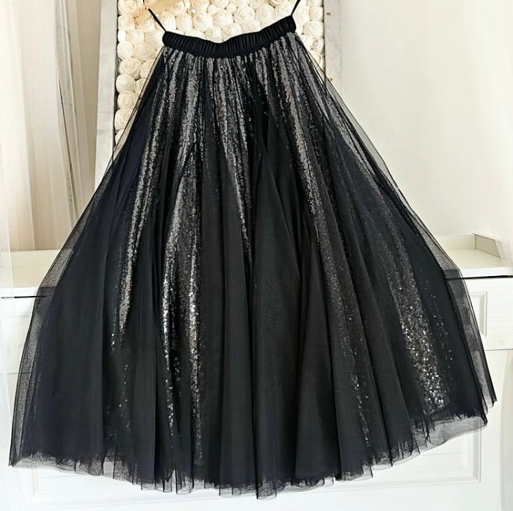 BLACK LONG TULLE SKIRT, SEQUIN SKIRT OUTFIT, PLUS SIZE LAYERED SEQUIN SKIRT, HIGH WAISTED WOMEN SEQUIN MAXI SKIRT, CUSTOM PLUS SIZE