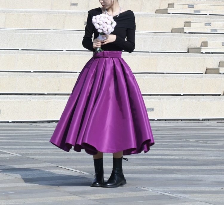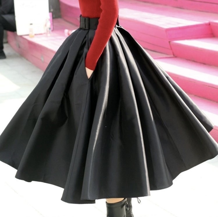 BLACK A-line Satin Skirt Outfit , Women Custom Plus Size Pleated Skirt , A-line Holiday Party Skirt with Pockets