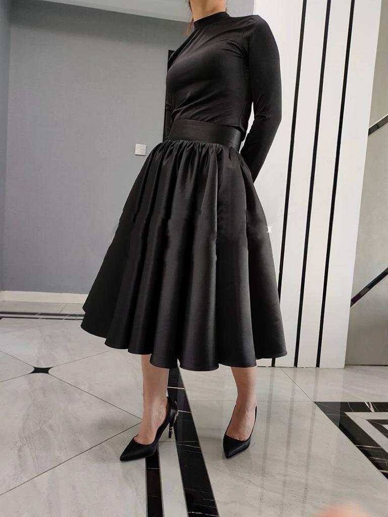 * High waist, full pleated. Actually this skirt is needed much more cloth than usual skirt.