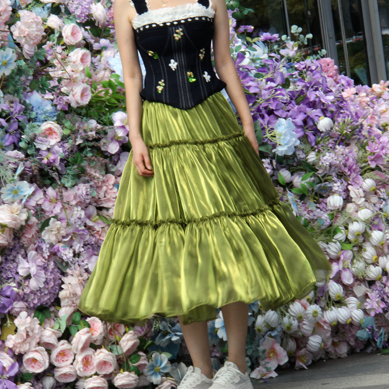 Olive Green A-line Satin Skirt Outfit Women Plus Size Taffeta Holiday Midi Skirt
